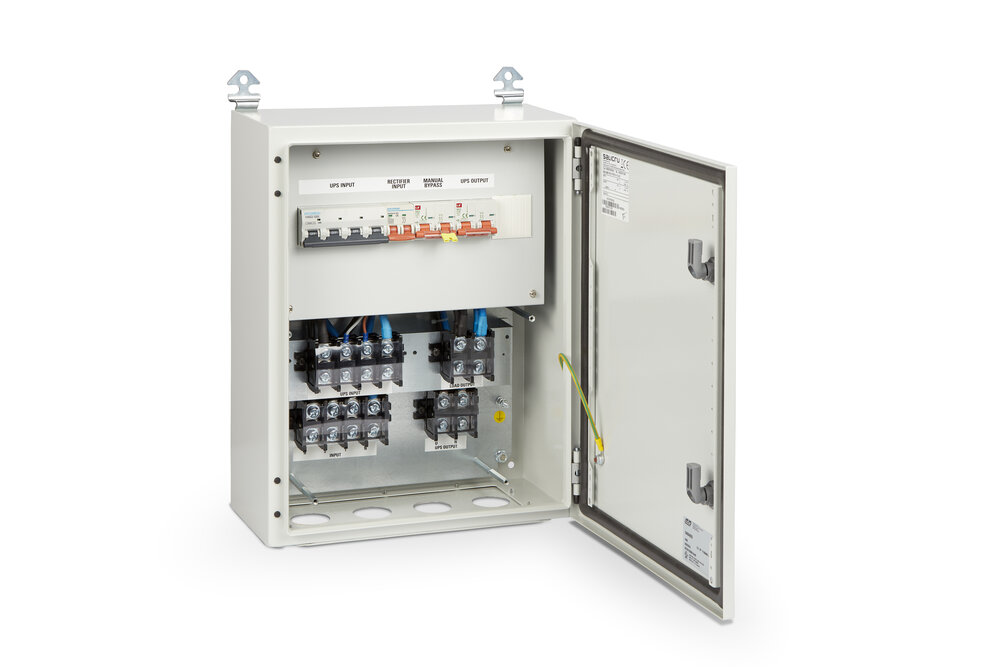 Bypass manual externo para realizar operaciones de mantenimiento, aislando eléctricamente el equipo. Tipo de bypass con solapado, "make before break".